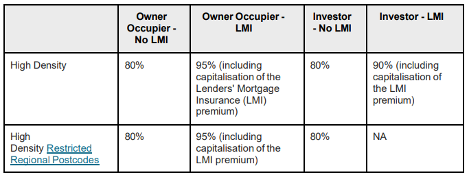 Increased maximum LVR for existing high-density units in 77 postcodes from 90% to 95% (inclusive of LMI) for Owner Occupiers.